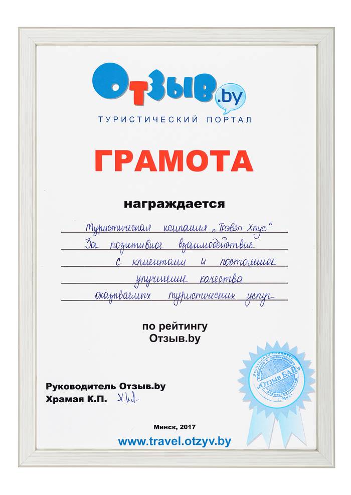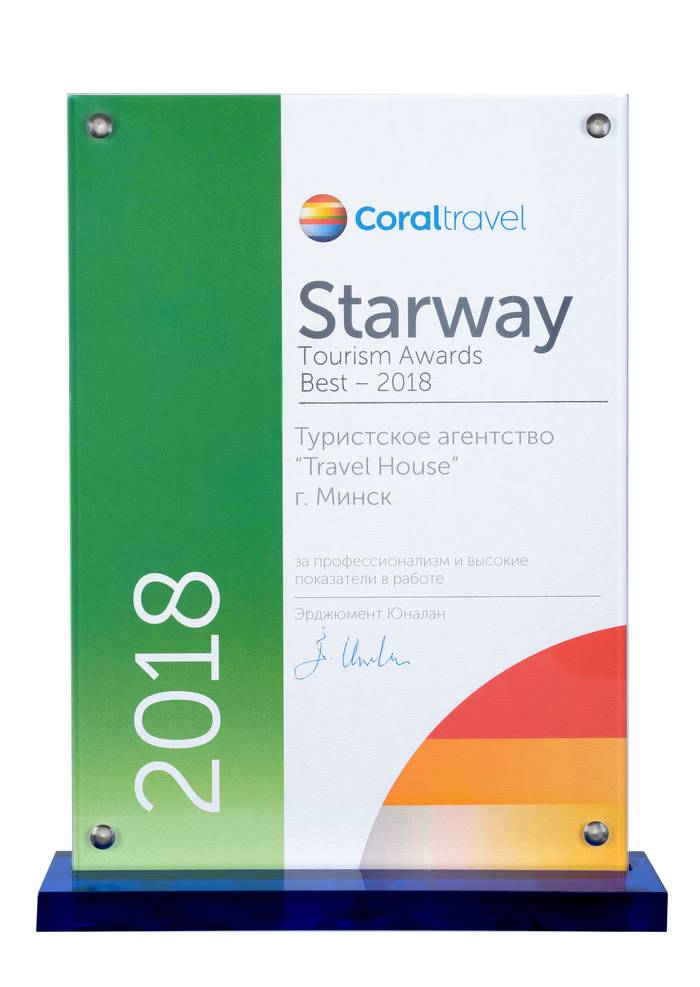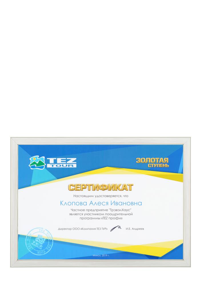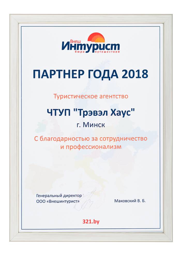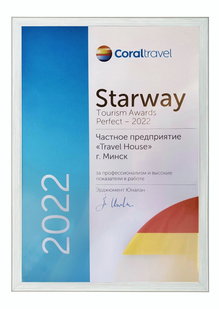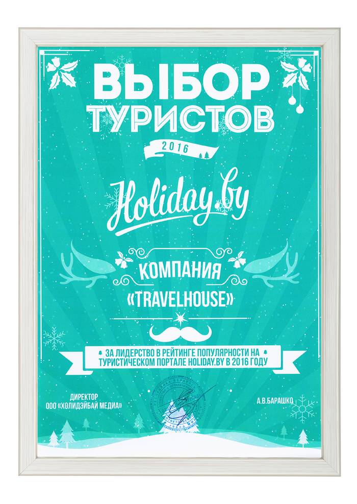 Сертификат соответствия № BY/112 04.03. 071.01 00109 выдан ГУ «Национальное агентство по туризму» Министерства спорта и туризма Республики Беларусь. Компания Travel House прошла добровольную сертификацию услуг. Ежегодно аудиторы ГУ «Национальное агентство по туризму» проверяют офисы продаж, уровень квалификации специалистов компании, внутреннюю документацию, договоры оказания туристических услуг, стандарты работы и подтверждают соответствие услуг компании актуальным требованиям Закона о туризме и другому законодательству Республики Беларусь.