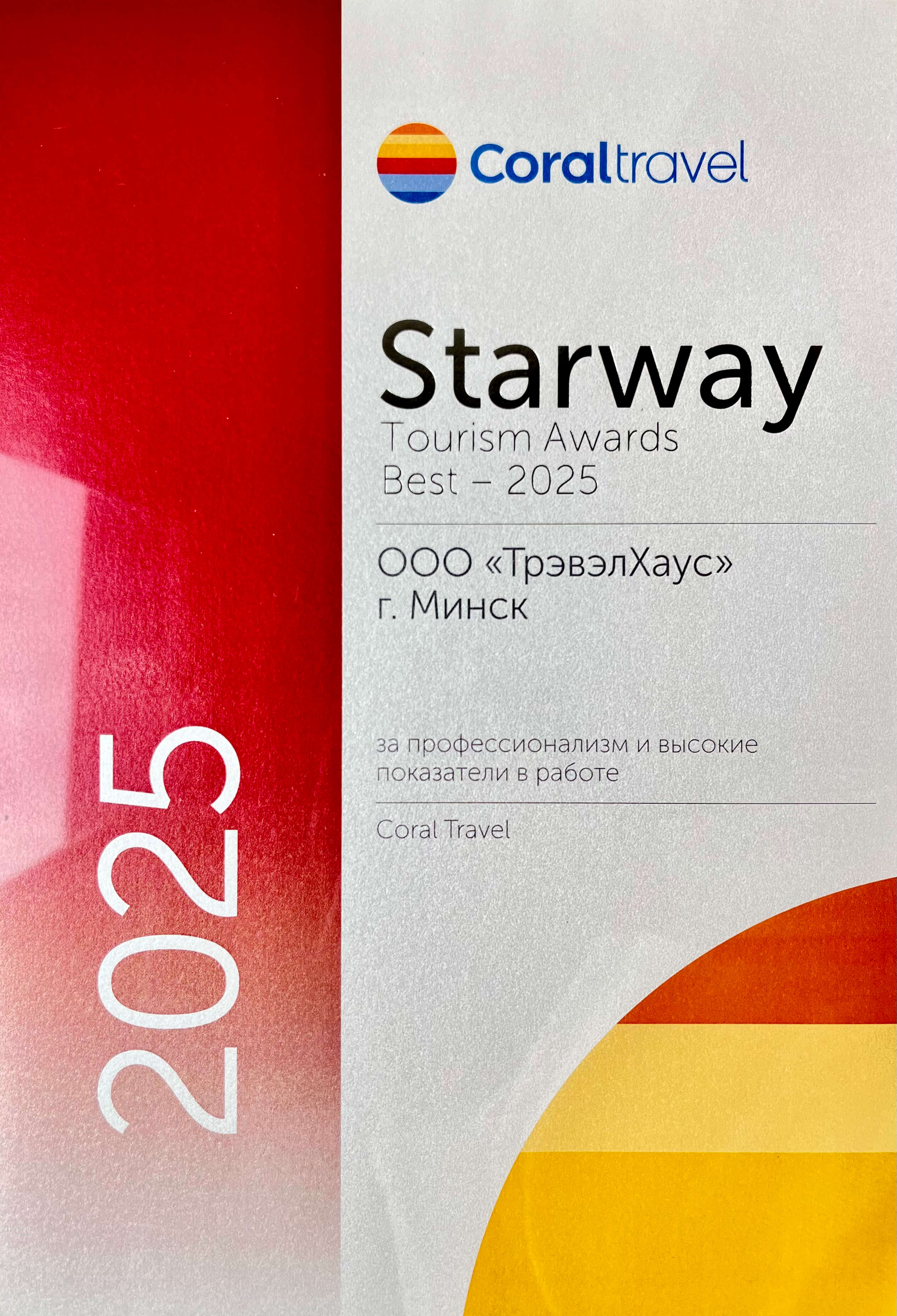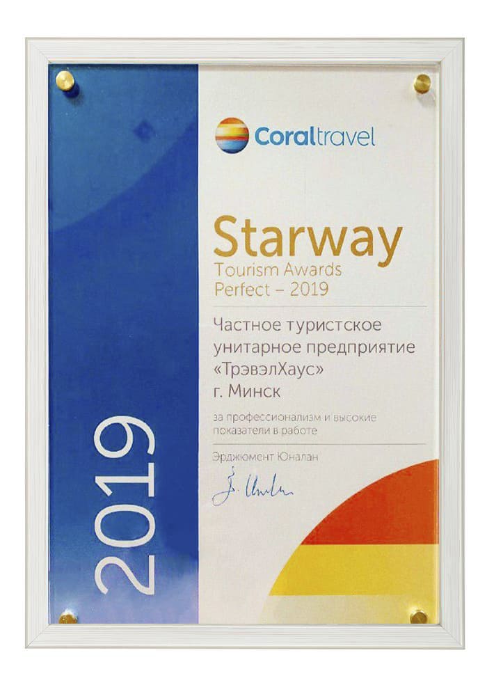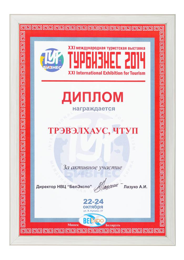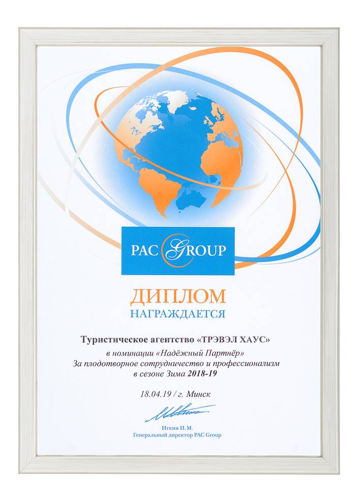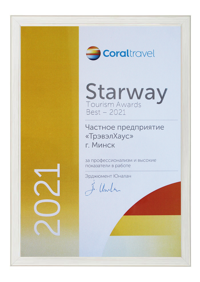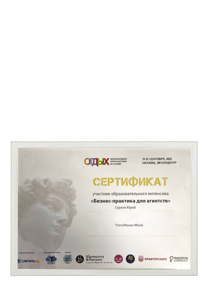 Сертификат соответствия № BY/112 04.03. 071.01 00109 выдан ГУ «Национальное агентство по туризму» Министерства спорта и туризма Республики Беларусь. Компания Travel House прошла добровольную сертификацию услуг. Ежегодно аудиторы ГУ «Национальное агентство по туризму» проверяют офисы продаж, уровень квалификации специалистов компании, внутреннюю документацию, договоры оказания туристических услуг, стандарты работы и подтверждают соответствие услуг компании актуальным требованиям Закона о туризме и другому законодательству Республики Беларусь.